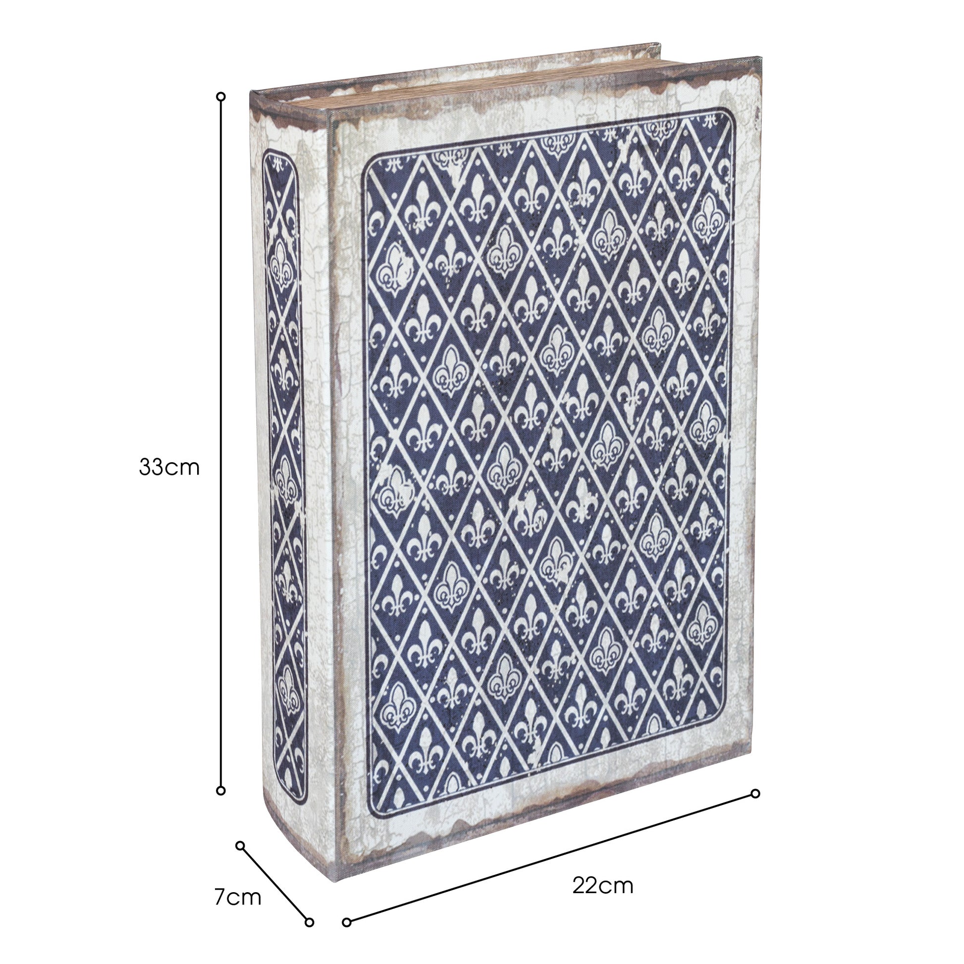Introducing our Fleur-de-lis Secret Storage Book Box, a stylish and elegant way to keep your treasures safe and hidden. With a timeless navy and white design and spacious dimensions of 33cm x 22cm x 7cm, this book box adds a touch of European sophistication to any space. Perfect for storing jewellery, keepsakes, and important documents.