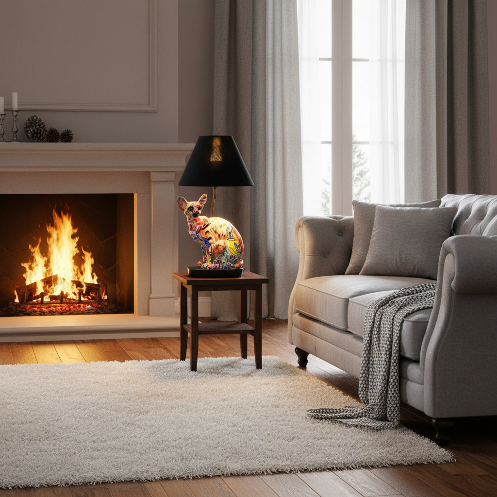 Meet your new feline friend with serious street cred. This funky graffiti-painted sitting cat brings urban edge to any room, featuring a sleek black exterior that contrasts beautifully with a shimmering reflective gold interior. Perfect for creating moody ambient lighting or a bold statement piece on your desk or bedside table. Simply pop in an E27 large screw bulb (sold separately) and watch this artistic kitty come to life. A purr-fect blend of contemporary art and functional style.