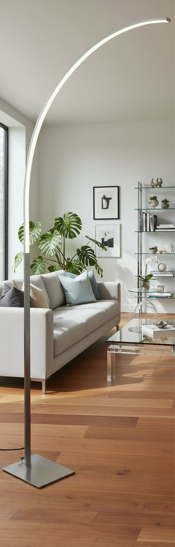 This sleek curved metal floor lamp features an advanced LED strip, available in matte black or satin nickel. Its bright white light delivers efficient illumination without the hassle of bulb replacements, helping to reduce energy costs. The elegant curved stem adds a contemporary touch, making it ideal for positioning over armchairs or sofas as a dedicated reading light. Designed with user convenience in mind, it includes a foot-switch for easy on/off control. A refined lighting solution for modern interiors.