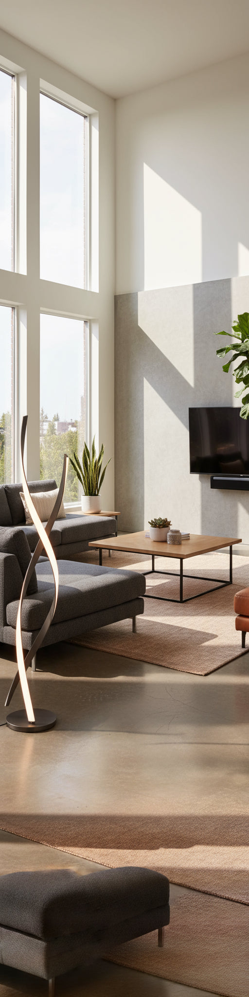 This contemporary LED lamp features a satin nickel finish and showcases a stunning double-helix spiral design. The intertwined strands mimic the natural symmetry of DNA, creating a visually captivating piece. Constructed from satin nickel and frosted acrylic, it combines aesthetic appeal with durability. Illuminated by energy-efficient LED strips, it delivers bright white light while reducing power consumption. This elegant fixture is both a functional light source and an artistic centerpiece that draws the eye with its graceful, continuous curves.