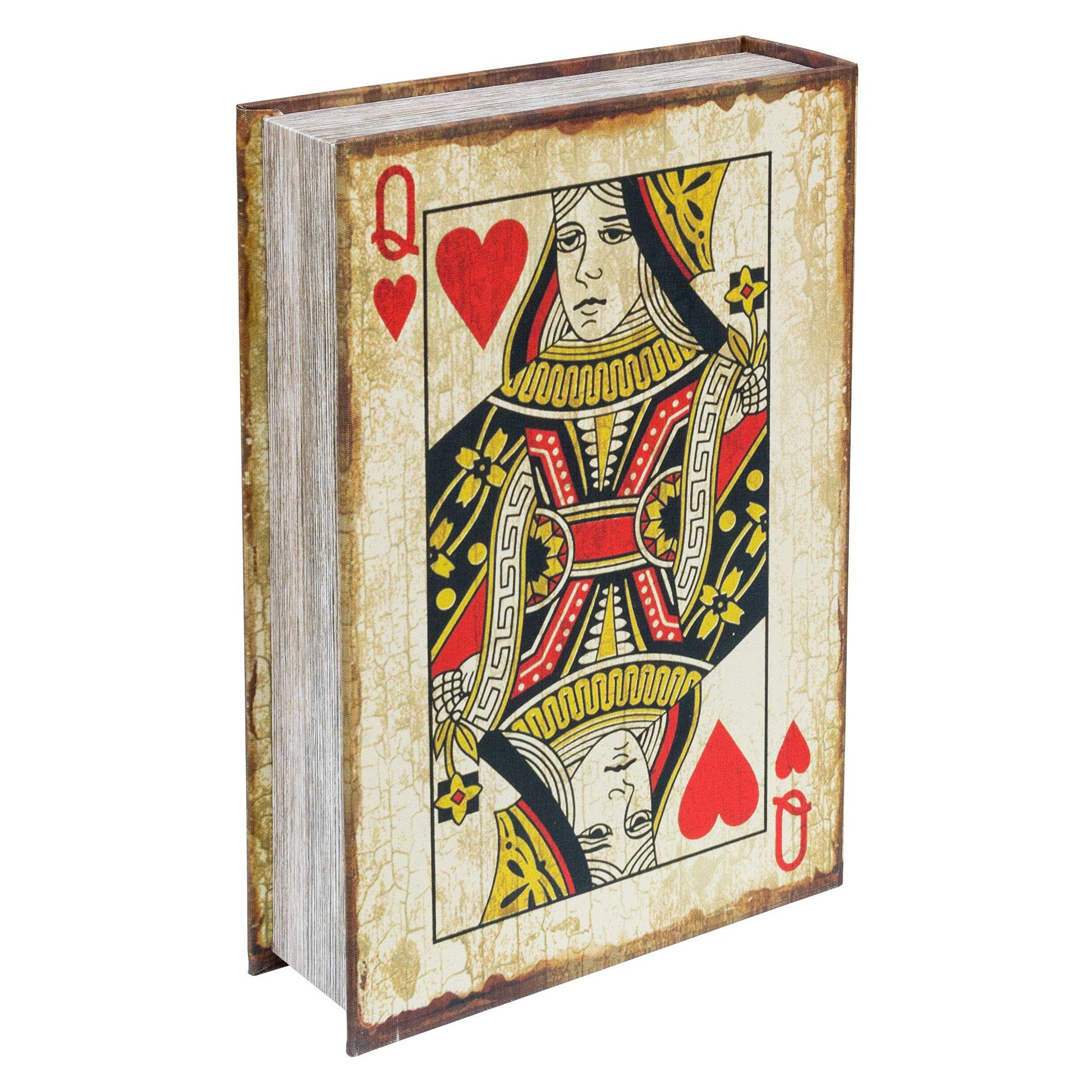 The Queen of Hearts Playing Card Secret Storage Book Box is a sophisticated storage solution that doubles as striking home décor. This oversized vintage-style book box features a captivating Queen of Hearts illustration across its cover and spine, making it an enchanting addition to any bookshelf or display surface. The distressed, dusty finish and faux spine detailing authentically mimic a classic tome, allowing it to blend seamlessly with real book collections or stand as a bold statement piece. Secured by a discreet magnetic closure, it offers hidden storage for jewellery, keepsakes, or treasured items while celebrating timeless elegance and the symbolic power of love and leadership.